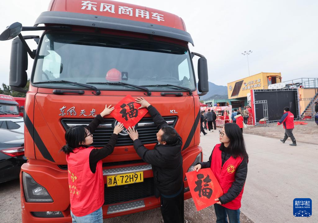 2月9日,在建德市更楼街道司机之家,志愿者们和货车司机把刚写好的福字贴到车头上。