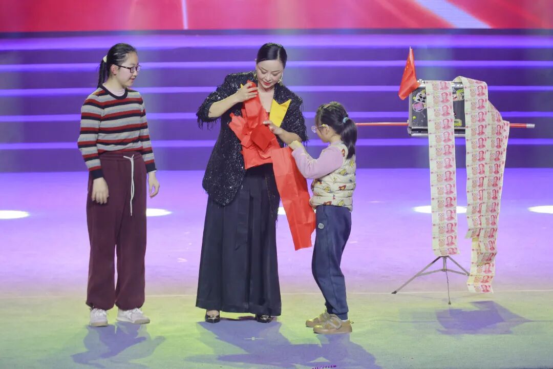值得一提的是,在引人注目的魔术环节,中国广播艺术团演员邀请两位儿童登台,孩子们小心翼翼将大红纸片撕成细碎雪花,眼中满是好奇与期待。魔术师轻轻一拢、一展,漫天红屑竟化作一幅遒劲有力的大字——“骐骥驰千里文化进万家”。祝福语悬于半空,墨香仿佛扑面而来。片刻静默之后,全场爆发出雷鸣般的掌声,有观众忍不住站起身,举起手机定格这满载年味与匠心的惊艳一刻。