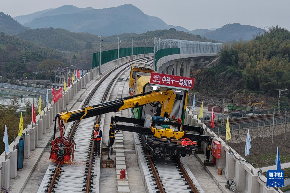 3月22日,在杭州至德清市域铁路施工现场,中铁十一局技术人员调试新能源多场景闪光焊轨机的落位,准备开展焊接作业。