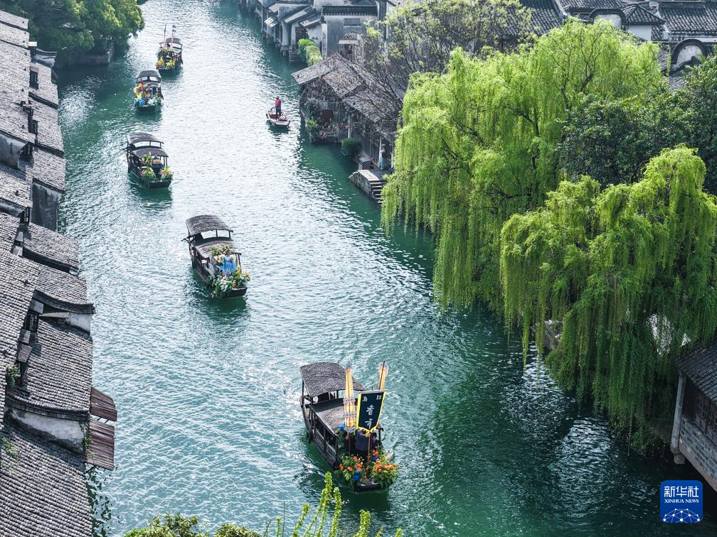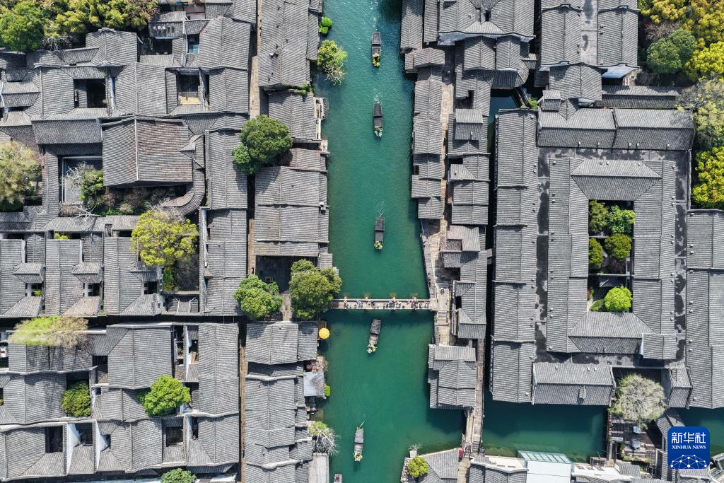 4月1日,乌镇香市蚕花盛会的船队在河道上巡游表演(无人机照片)。