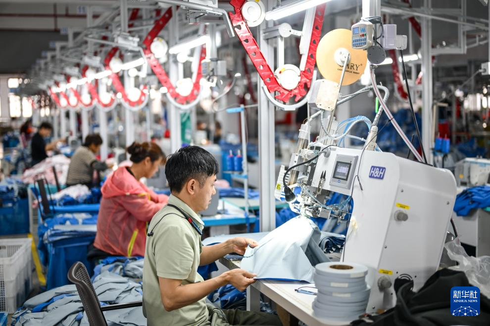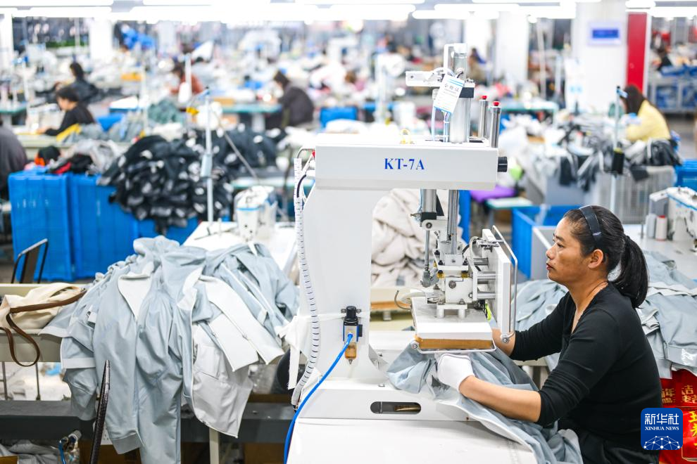 4月10日,顾客在台州市三门县一公司展厅内挑选衣物。